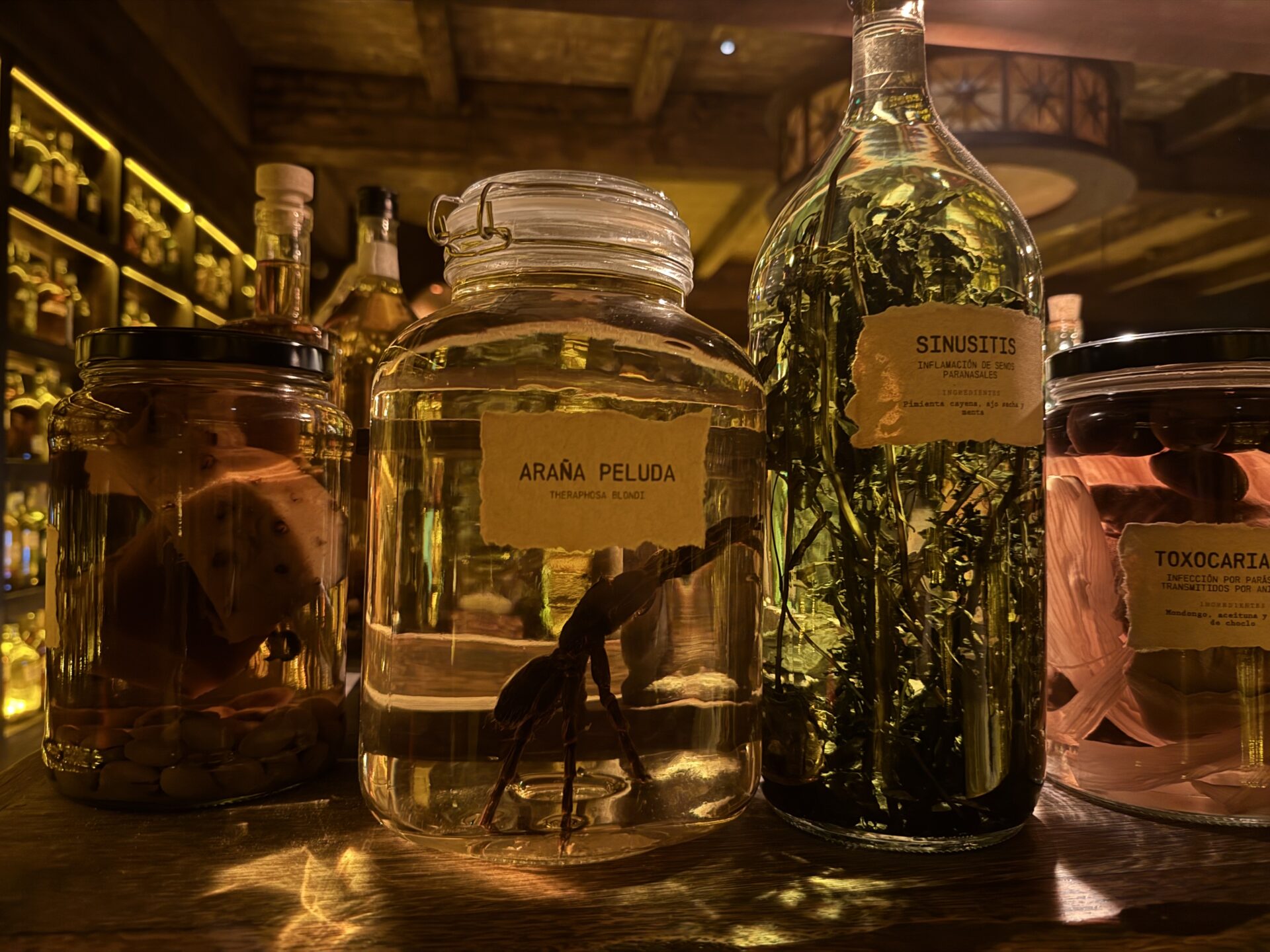 中には巨大なクモやアリ、ピラニアなどなど、生き物が漬けられているものもありました。