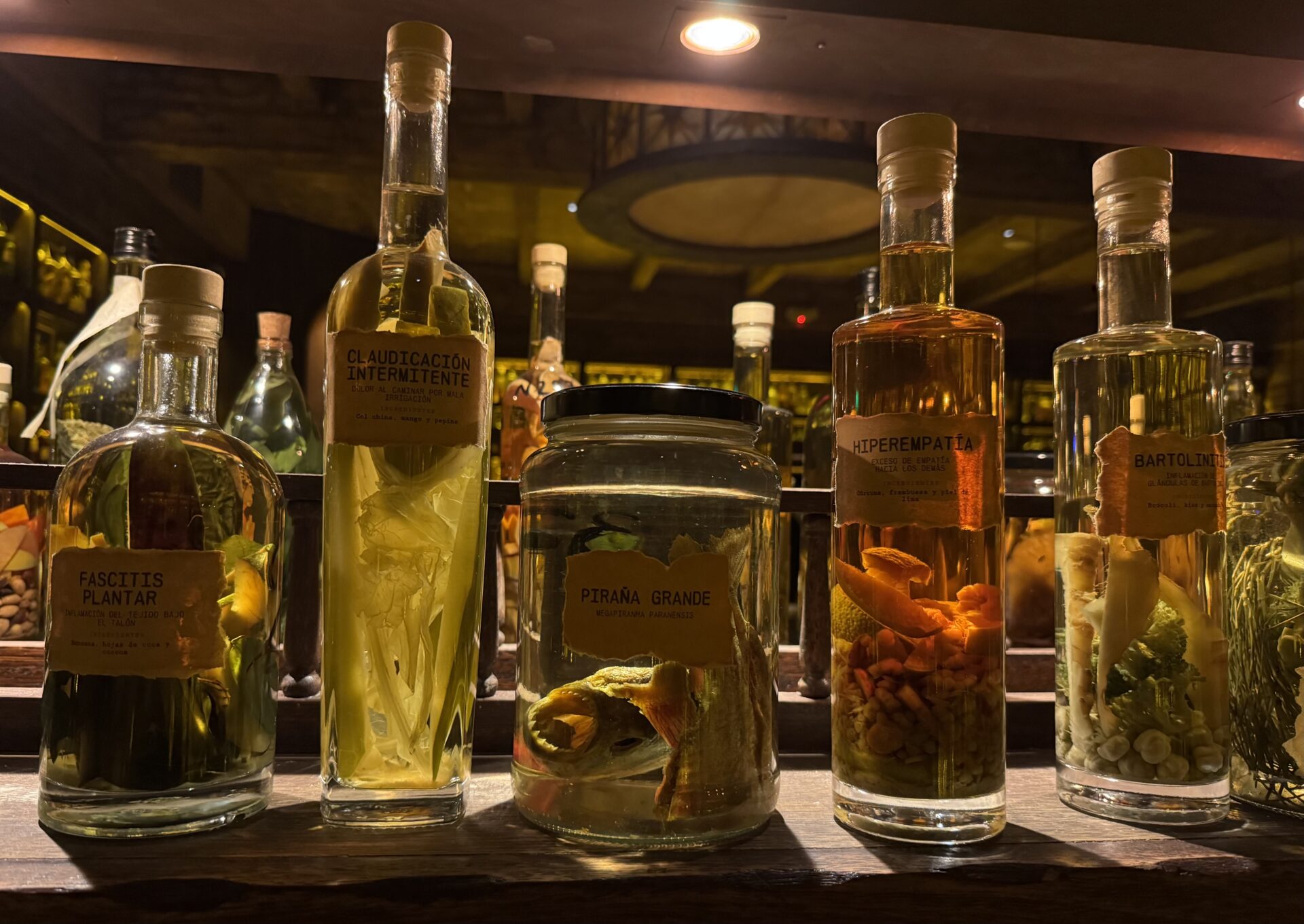 ペルーの伝統酒「Yonque(ヨンケ)」の中にさまざまな野菜や果物、植物が浸け込んであります。